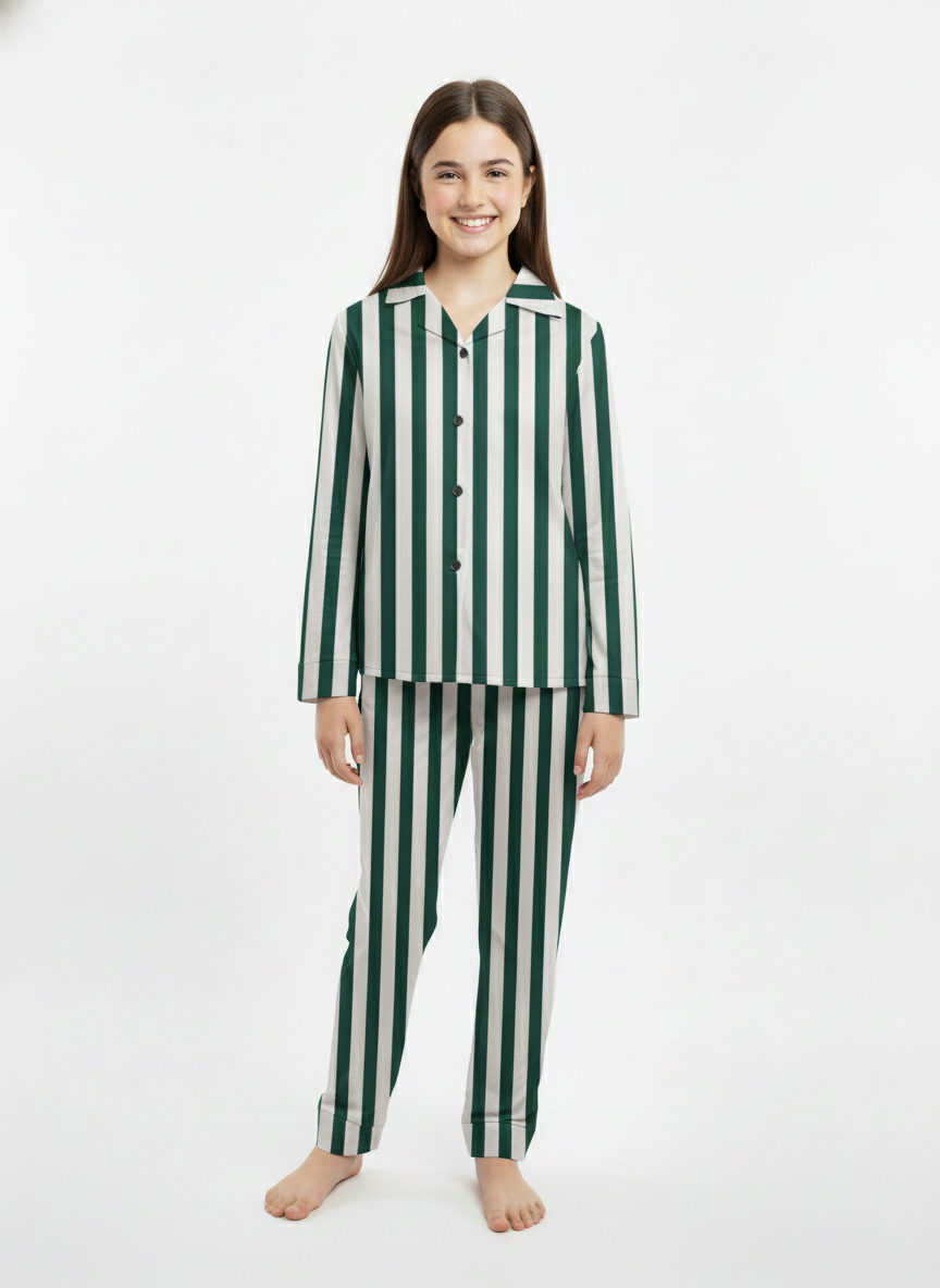 Bring comfort and style to bedtime with our Girls Green & White Striped winter Night Suit. Made from premium-quality soft winter fabric, this nightwear set ensures a cozy and breathable feel all night long. The elegant vertical stripes in green and white add a fresh and trendy look, making it perfect for both lounging and sleeping. The button-down shirt with a classic collar and full sleeves pairs perfectly with matching straight-fit pajama pants, providing a relaxed yet neat fit. Designed for durability and comfort, this night suit allows easy movement and is gentle on the skin β ideal for everyday wear. Whether itβs a chilly night or a lazy weekend morning, your little one will stay comfortable and stylish. Available in multiple sizes, itβs easy to wash and retains its shape and softness even after multiple washes.